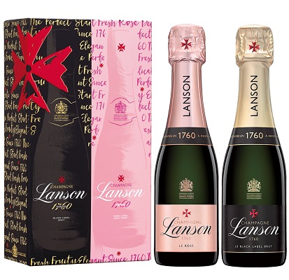 Special Offer. Buy 6 Twin Packs for £27.50 each. Save £15.00 !! (Case of 6 x twin packs contains 12 mini bottles – 6 x Brut 20cl and 6 x Rose 20cl) The Lanson 20cl Twin Pack consists of 1 x Lanson Black Label 20cl and 1 x Lanson Rose Label 20cl presented in a Lanson branded gift box. Lanson Black Label – Tasting Notes To the eye the brilliant, limpid colour recalls the characteristic straw tones of the Pinot Noir, with glints of amber. It is lively in the flute, with a fine stream of persistent bubbles. On the nose it gives an impression of vitality and springtime scents, together with hints of “toast” and from a variety of flowers. In the mouth a bouquet of ripe fruits and citrus create a sensation of plenitude and lightness. A pleasant racy wine with a long and lingering taste. To be enjoyed at all occasions. Grape Variety: 35% Chardonnay, 50% Pinot Noir, 15% Pinot Meunier. The blend is made of wines from between 50 to 60 different crus Lanson Rose Label – Tasting Notes A rose champagne with a beautiful pure colour with pale salmon touches. On the nose aromas of roses and fruit predominate, with discrete notes of red fruit. On the palate the initial impression is tender; well-rounded and fresh, this wine has harmonious balance and good length on the finish. Lanson Rose is the ideal Champagne to accompany white meats or fresh fruity desserts. Grape Variety: 32% Chardonnay, 53% Pinot Noir, 15% Pinot Meunier. The blend is made of wines from between 50 to 60 different crus Background Information: One of the oldest champagne house, Lanson was founded in 1760 by Francois Delamotte, a magistrate from the Reims. The values and expertise that created the unique and enduring style of Champagne Lanson have been handed down from generation to generation. Since 1760, this has been the guiding philosophy of the successive generations that have promoted Lanson throughout the world. Centuries in the dedicated pursuit of perfection have established the House of Lanson as one of the premier champagne makers. Today, the marriage of a contemporary dynamism with age-old tradition brings pleasure to millions the world over. Champagne Lanson is one of the few houses in the Champagne region that chooses not to use malolactic fermentation. This decision guarantees the freshness and optimal development of the wines’ flavours, allowing vintages to mature fully and evolve their complete array of aromas.. For adults of legal drinking age. Please drink responsibly.