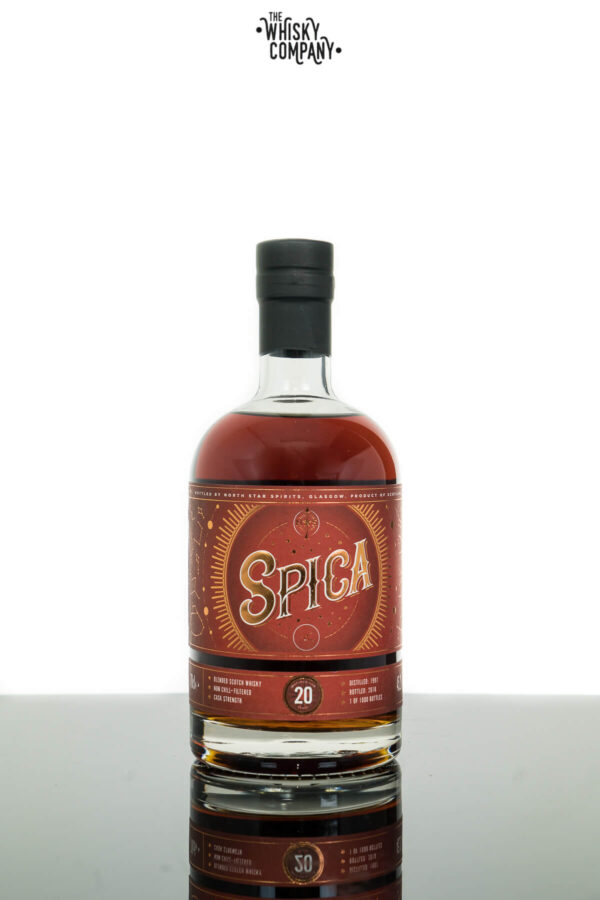 Spica 20 Years Old Blended Scotch Malt Whisky (North Star) (700ml) Volume: 700ml ABV: 45.2% Age: 20 Years Old Country: Scotland Chill-Filtered?: Non chill-filtered Spica facts: Part of the constellation VIRGO, 16th brightest star in the sky, 250 light years from Earth, SPICA comes from the latin phrase ‘Ear of Wheat’, VIRGO is associated with the Greek goddess of the harvest ‘Ceres’. This is a limited edition blended Scotch whisky, aged 20 years in European and American oak barrels. Only 1000 bottles available worldwide. Distilled in 1997 and bottled in 2018. Our Tasting Notes Nose: Treacle toffee, fresh fruit salad, chocolate coated raisins. Taste: Dried dark fruits, quality dark chocolate, balanced sweetness and wonderful oak. Finish: Toffee, black pepper and stick date pudding sauce. . For adults of legal drinking age. Please drink responsibly.